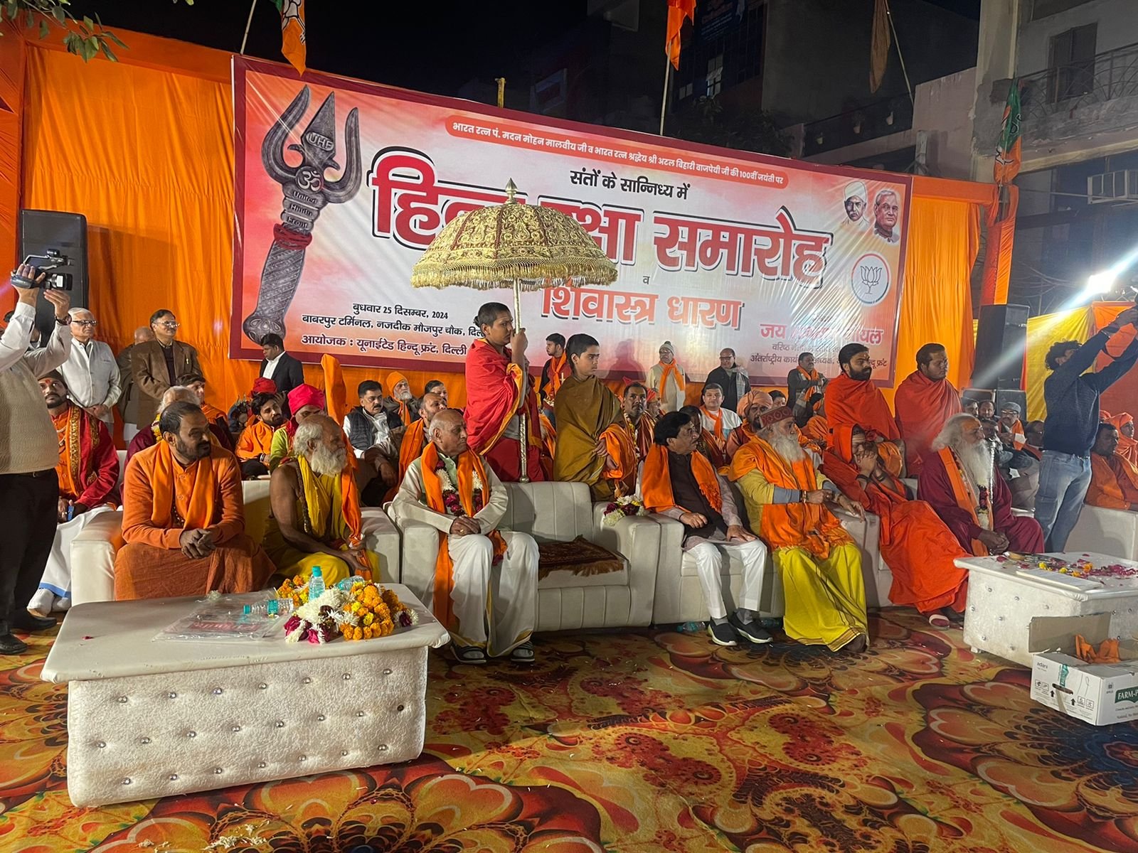 नई दिल्ली। काशी विश्व विद्यालय के प्रणेता, भारतीय विद्वान, श्रेष्ठ वकील  व राजनीतिज्ञ और भारत रत्न से सुशोभित महामना मदन मोहन मालवीय जी तथा मातृभाषा हिन्दी के प्रबल समर्थक ,उच्चकोटि के कवि एवं राजनीतिज्ञ श्री अटल बिहारी वाजपेयी जी के 100वें जन्म दिवस के उपलक्ष्य में विशाल ’हिन्दू रक्षा समारोह’ का भव्य आयोजन किया गया। इस अवसर पर करीब 5100 युवक -युवतियों को शिवास्त्र धारण करवाकर अपनी रक्षा स्वयं करने के लिए प्रेरित किया गया।